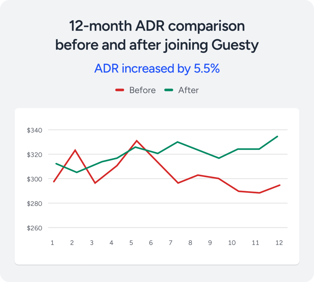 Boosting revenue potential: In the first 12 months after joining Guesty, our research group saw their average daily rate (ADR) increase by +5.5%, during the same period that industry benchmarks recorded an overall -6% ADR drop. Guesty’s AI-powered pricing tools optimize daily rates by balancing guest appeal and manager profitability, using real-time market insights. In an increasingly competitive market, strategic pricing intelligence and optimization tools are key to offering the best rates to maximize both ADR and occupancy.