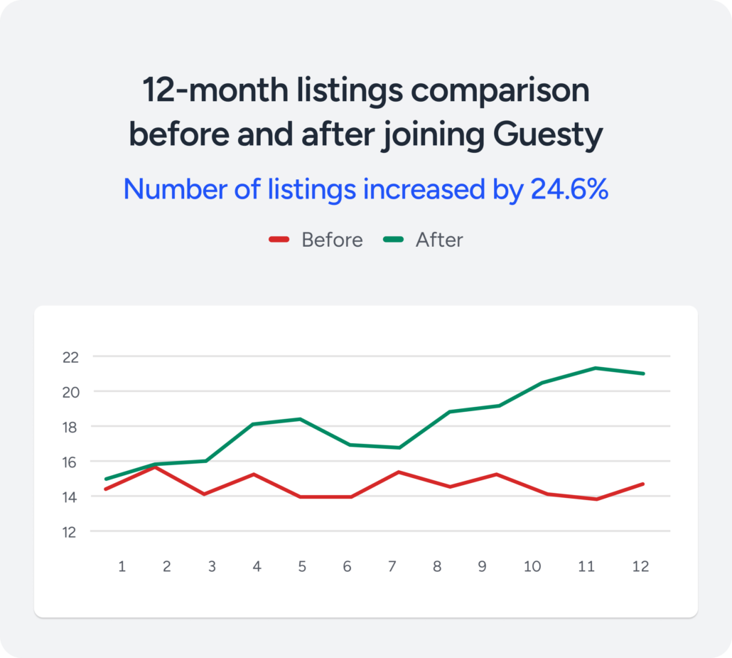 Let’s take a hypothetical manager in charge of 12 listings, with an average of $195 ADR and 55% occupancy. Our research suggests that partnering with Guesty could deliver the following growth metrics after 12 months: 15 listings, $203 ADR, and 58% occupancy. Most crucially, our manager could see yearly revenue increase from $469,755 to $644,334, a 37.2% boost!