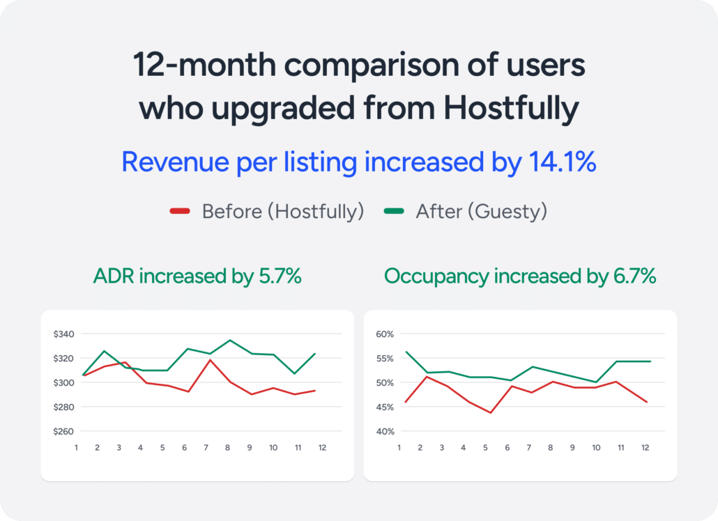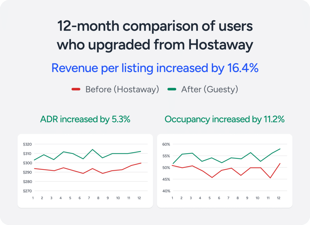 Our data shows that property managers who switched from Hostaway recorded an average +16.4% increase in revenue per listing during their first year with Guesty, equating to an additional $8.9k in revenue per listing on average. This performance improvement was driven by a +5.3% increase in ADR from $293 to $309, as well as a substantial +11.2% rise in occupancy. Check out a full comparison of Guesty vs Hostaway.