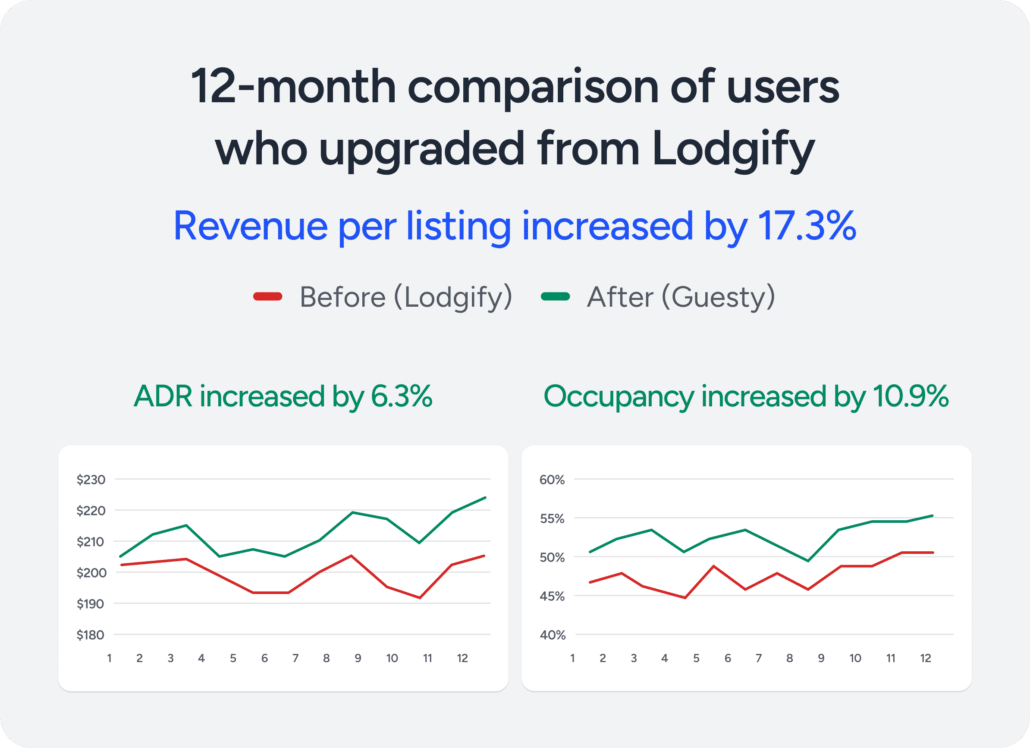 Our research shows that property managers who previously used Lodgify saw their first year revenue per listing increase by an average of +17.3%, or $6.8k. We can credit this improvement to a 6.34% rise in ADR from $199.7 to $213, as well as a +10.96% increase in occupancy, compared with their full year with Lodgify. Here is a full comparison of Guesty vs Lodgify.