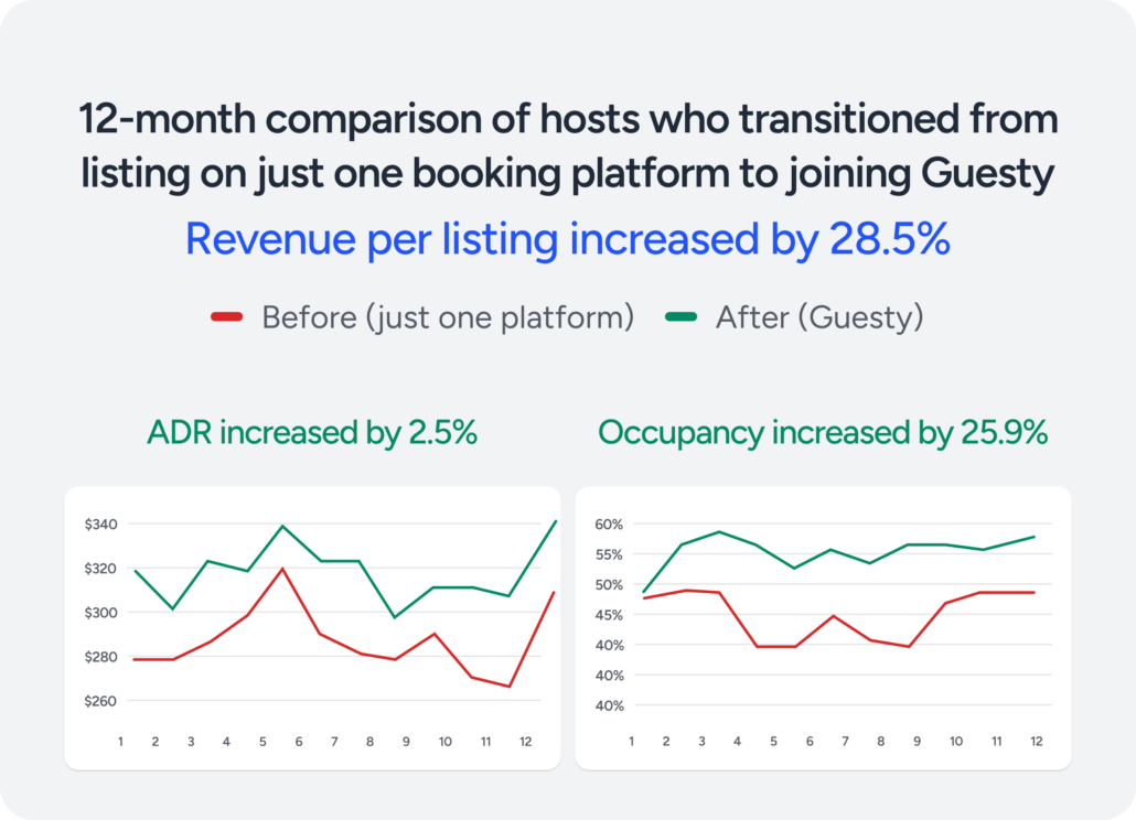 Hosts who transitioned from listing on just one booking platform (Airbnb, for example) to adding Guesty as their property management partner saw even more impressive results. For this group, average revenue per listing increased by a remarkable +28.5%, or $12.8K per listing.