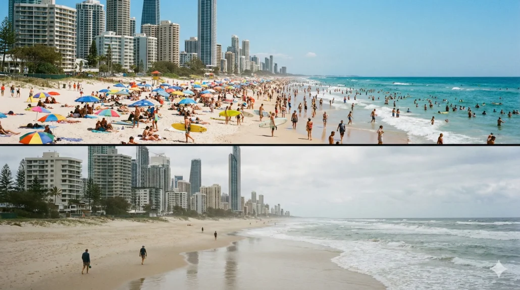 - Seasonality: Warmer months on the Gold Coast and Sunshine Coast, winter city breaks, ski season in alpine regions.