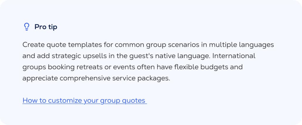 You can now share one quote to guest groups while offering individual confirmation and payment options to simplify events, retreats, and family gatherings. International groups on the way? Tailor quotes to their language with smart auto-detection or manual control to ensure every guest understands their booking details clearly, eliminating back-and-forth communication that drains staff time.