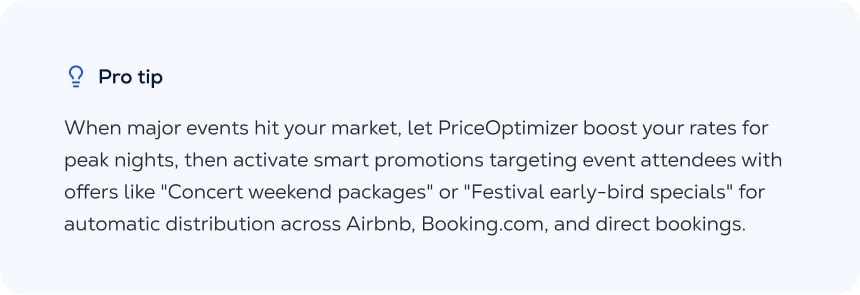 You’ve heard about the Taylor Swift effect. A high-profile event in your region hikes up rates, and you need a new pricing strategy to keep up. Guesty PriceOptimizer now factors in local concerts, festivals, and sports events, allowing you to capture surging demand and push targeted promotions across booking channels.