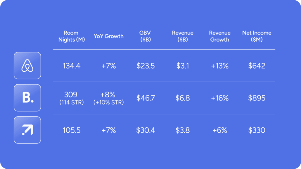Unified growth momentum masks regional disparities. All three platforms delivered room night growth of 7-8% year-over-year, with Airbnb reaching 134.4M nights, Booking.com achieving 309M total nights (114M STR), and Expedia recording 105.5M nights (including STRs and hotel nights across all brands). However, this aggregate strength masked regional disparities, as Asia and Latin America drove outperformance.