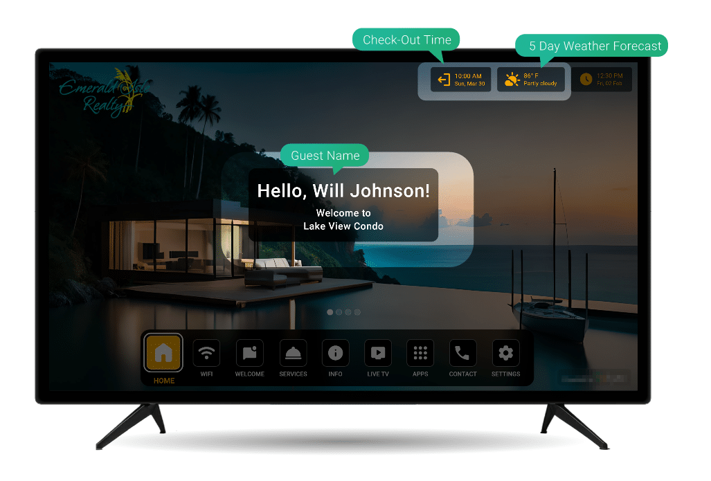Use your existing TV with Aruvo’s plug-and-play TV app to welcome guest with branded, personalized TV screen.