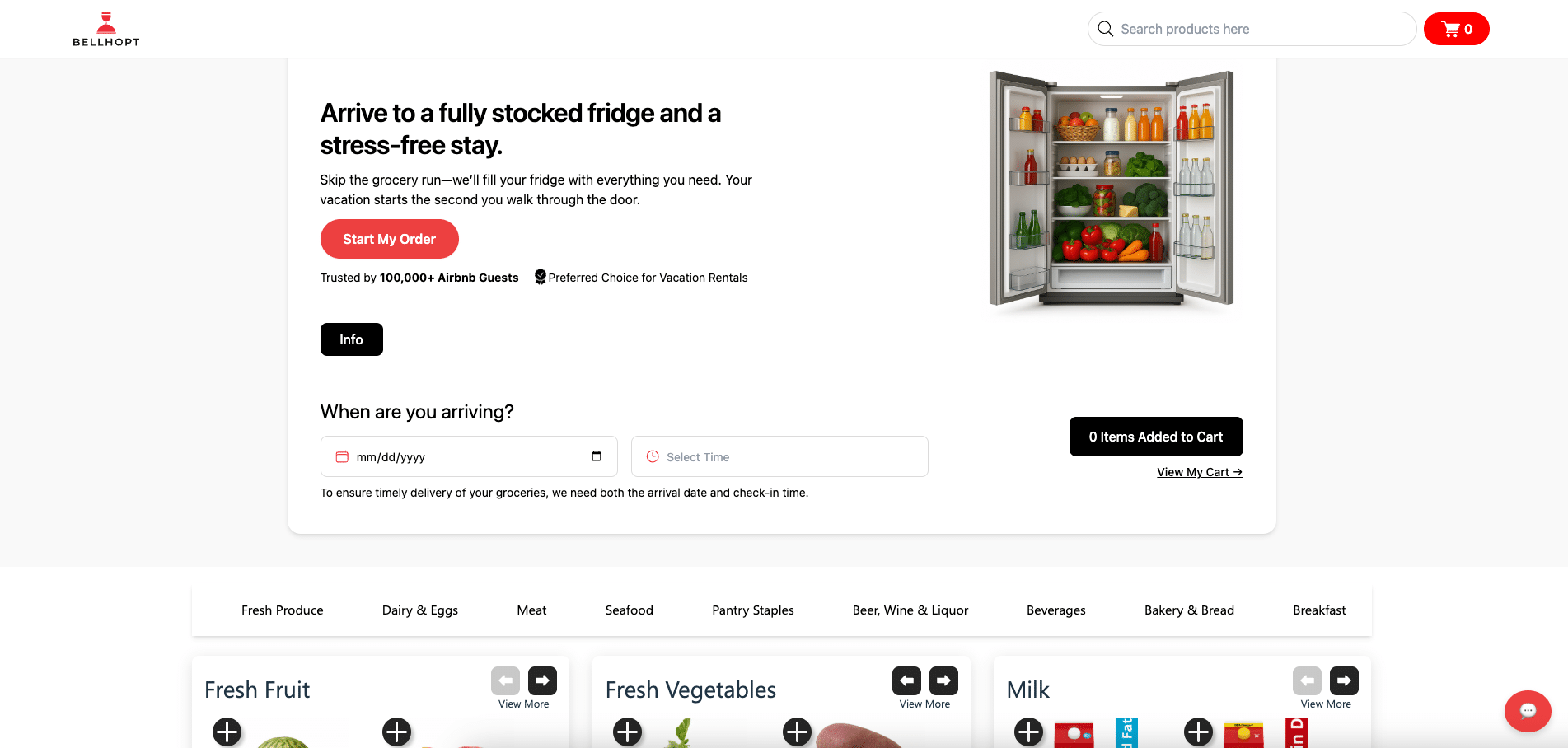 Elevate guest arrivals with Bellhopt’s luxury pre-arrival grocery delivery, stocking, and online ordering platform seamlessly integrated with Guesty.