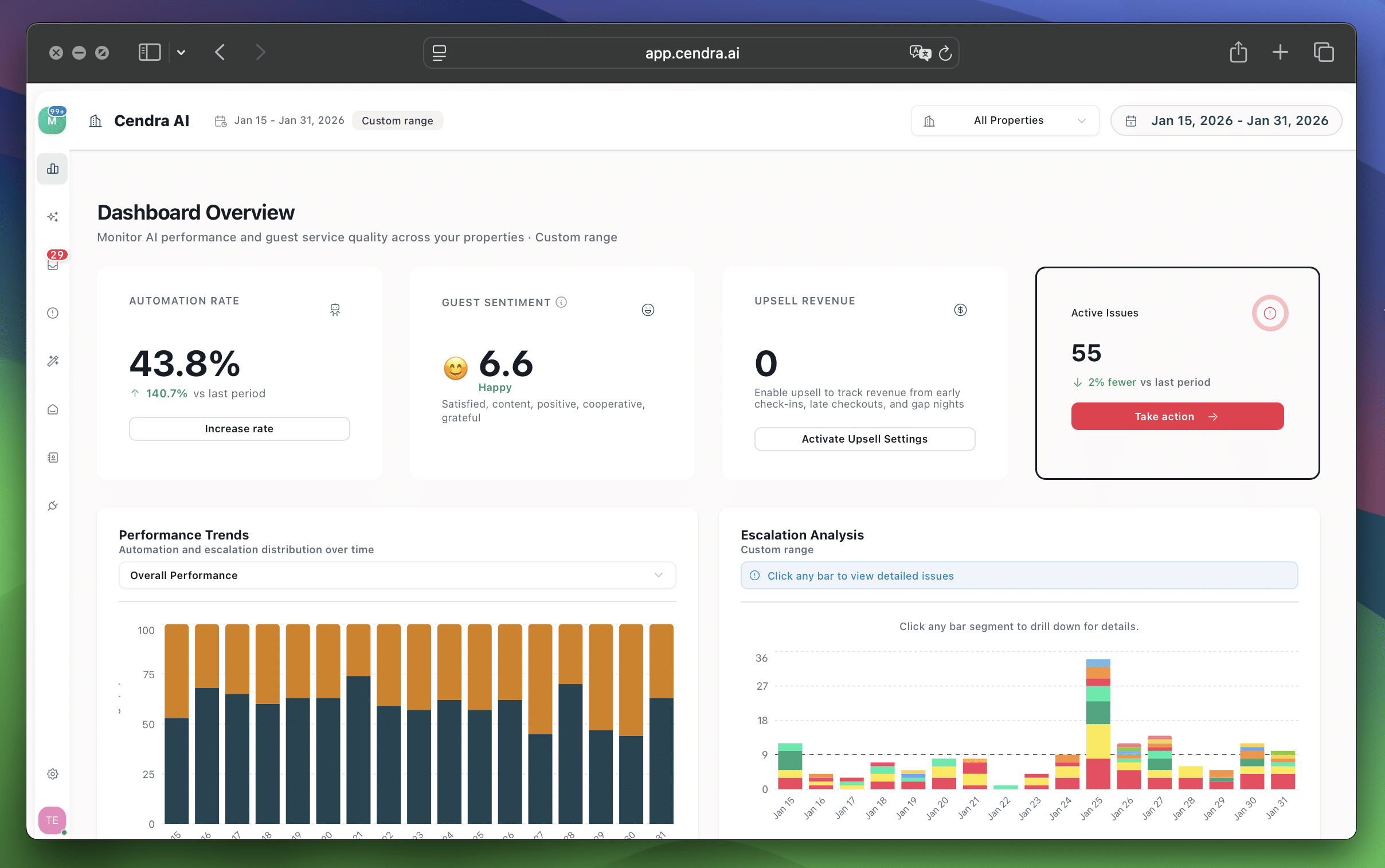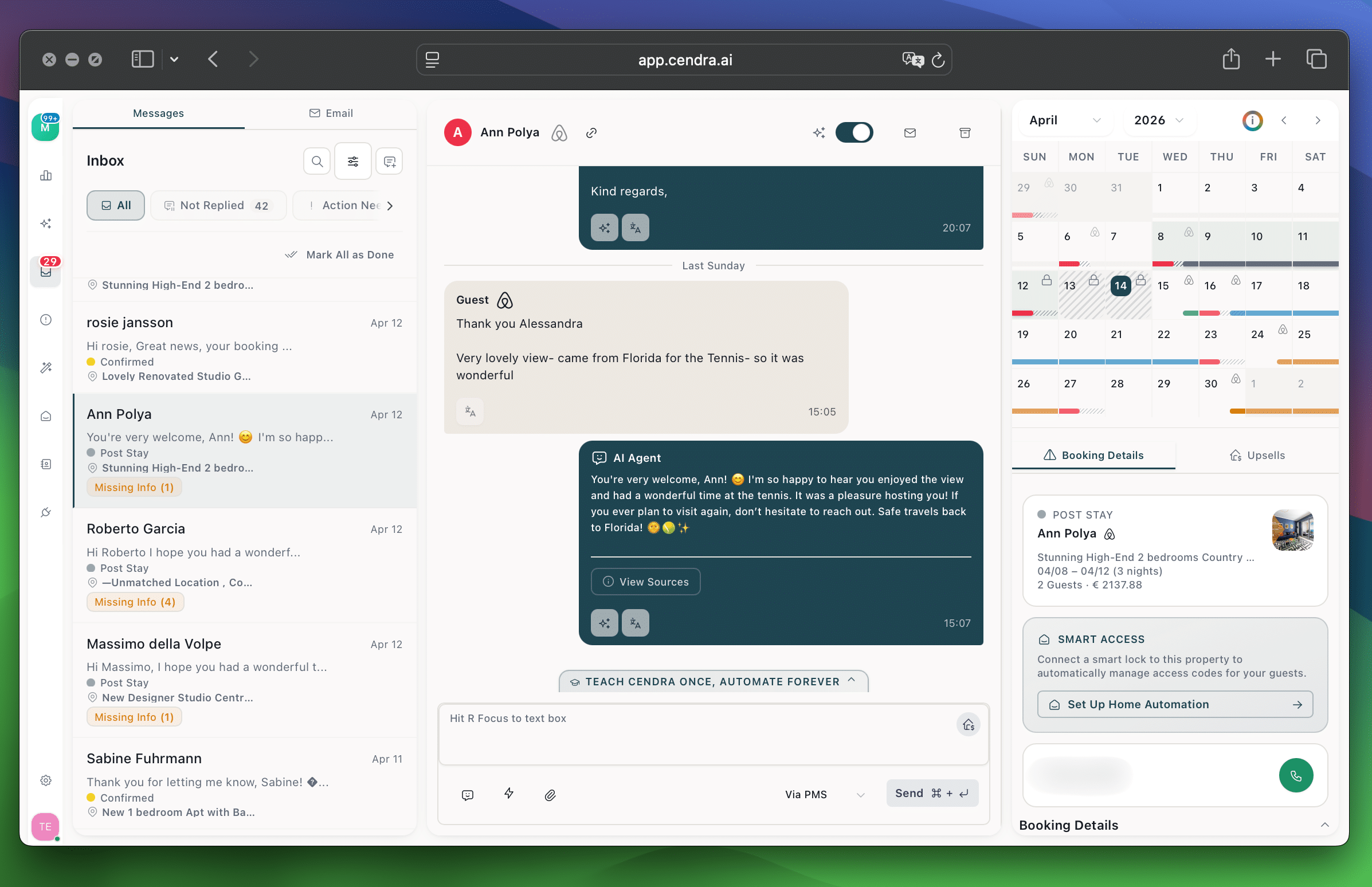 - Cendra streamlines guest communications into one unified system. Stay in control: choose full automation or review AI-generated drafts before sending.