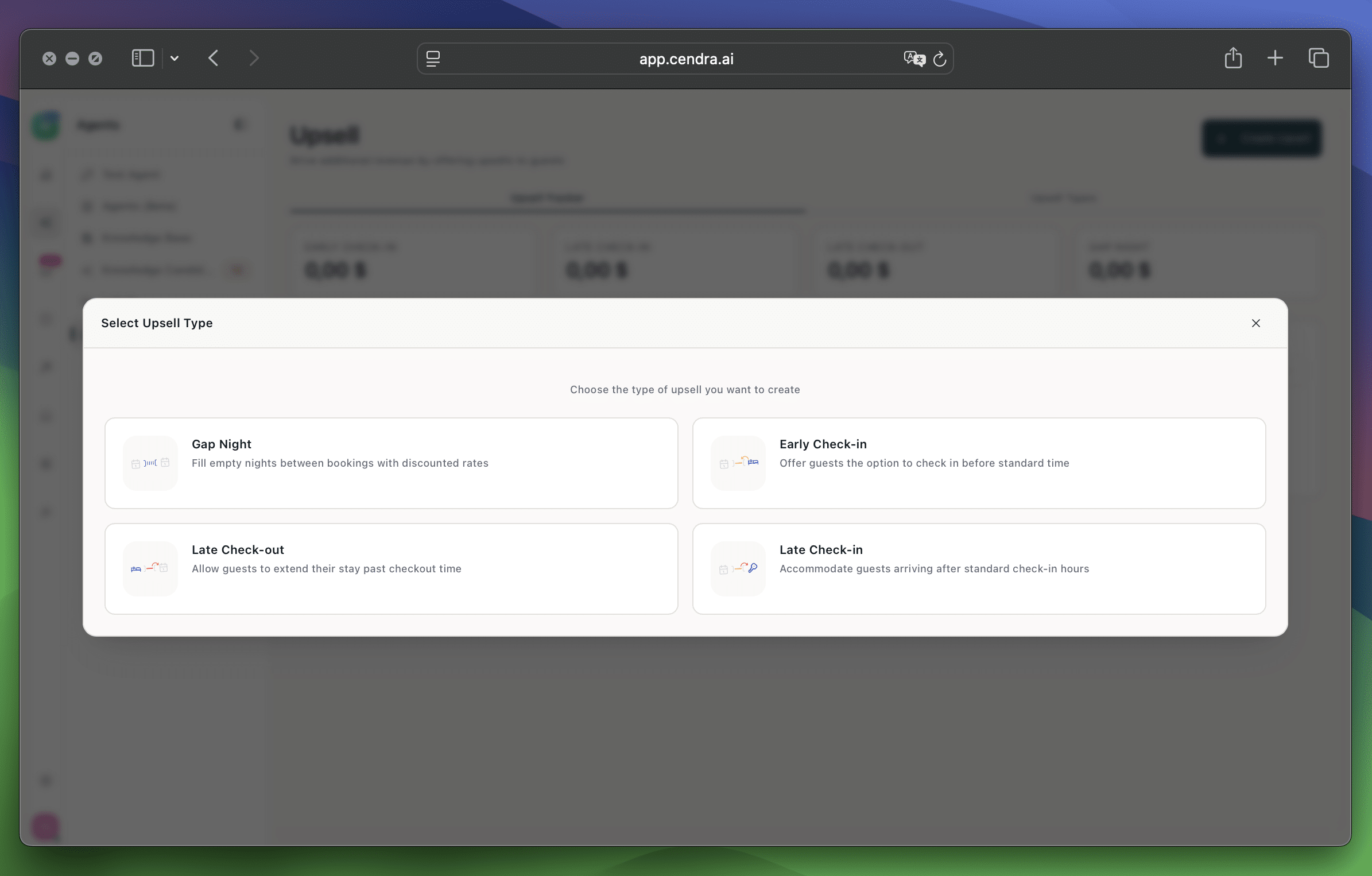 - Cendra automatically identifies opportunities — like gap nights, early check-ins, or late check-outs — and offers them to your guests.