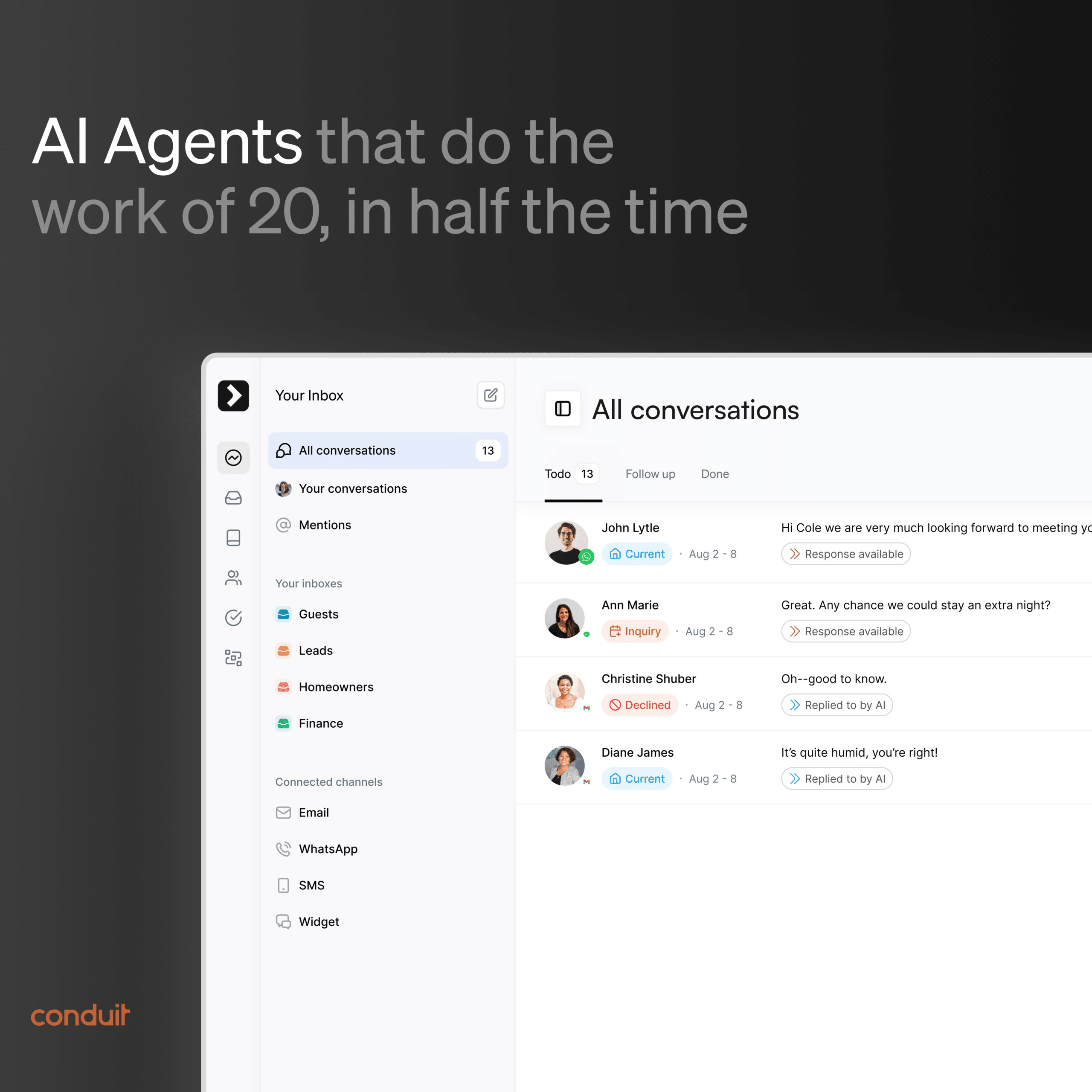 Conduit is the all-in-one support platform designed for property management, housing, and hospitality businesses. Unlike conventional support tools, Conduit unifies communication, data, and collaboration in a single place—streamlining operations, improving efficiency, and enhancing client retention.