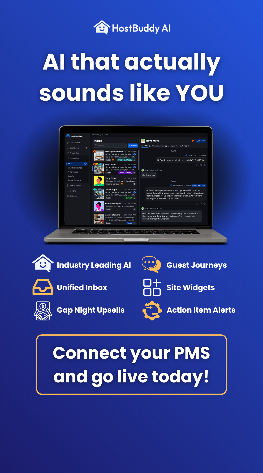 Onboarding is effortless, pulling listing details and historical conversation data directly from your PMS. HostBuddy also enhances direct booking websites with an embeddable chat widget to answer pre-booking questions and improve conversion. By streamlining communication, maximizing revenue opportunities, and reducing manual workload, HostBuddy frees hosts to focus on growing their business. Welcome to the future of hosting.