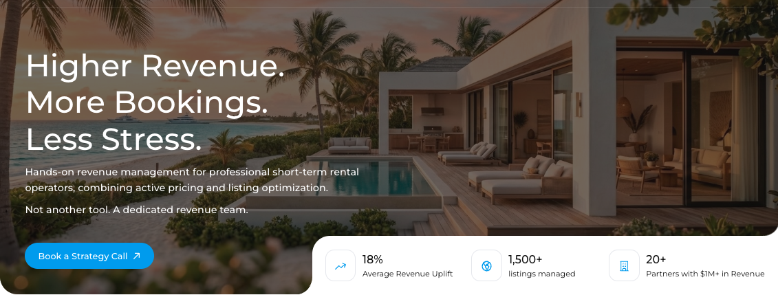 Not another tool — a dedicated revenue team. We support 1,500+ listings per month and deliver ~18% average uplift across portfolios.