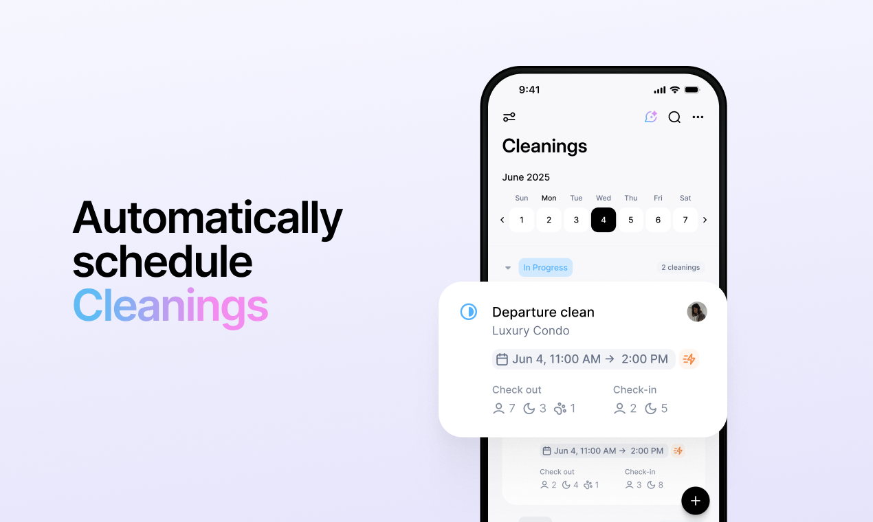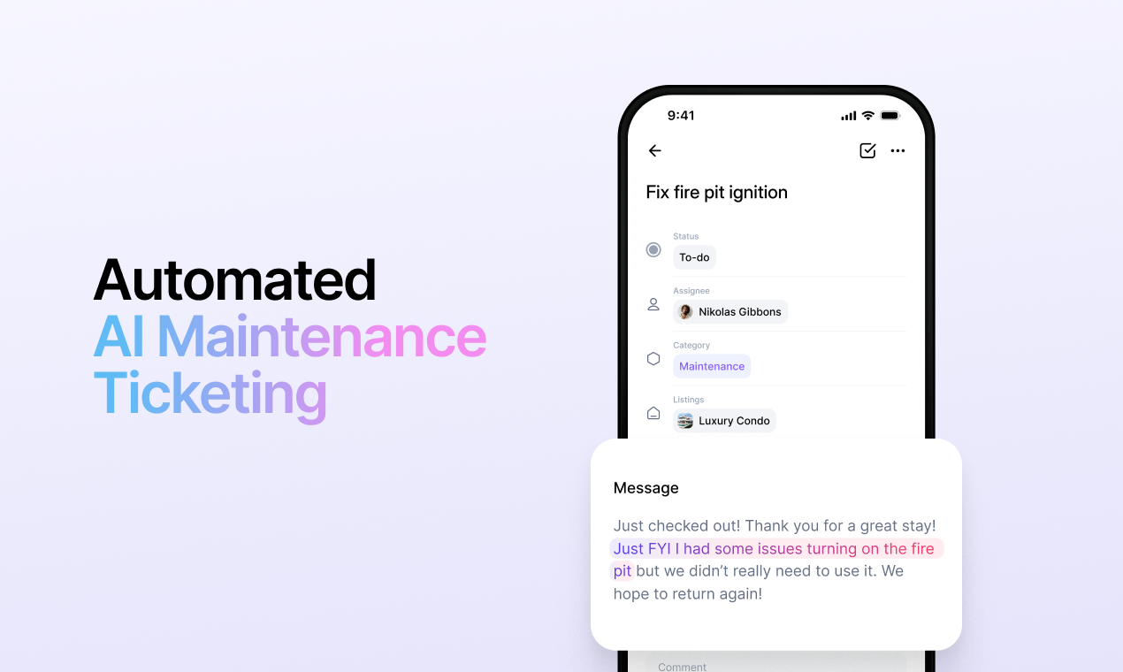 - AI Task & Cleaning Automation: Automatically create maintenance tasks from guest messages and reviews. Automatically schedule & manage cleanings.