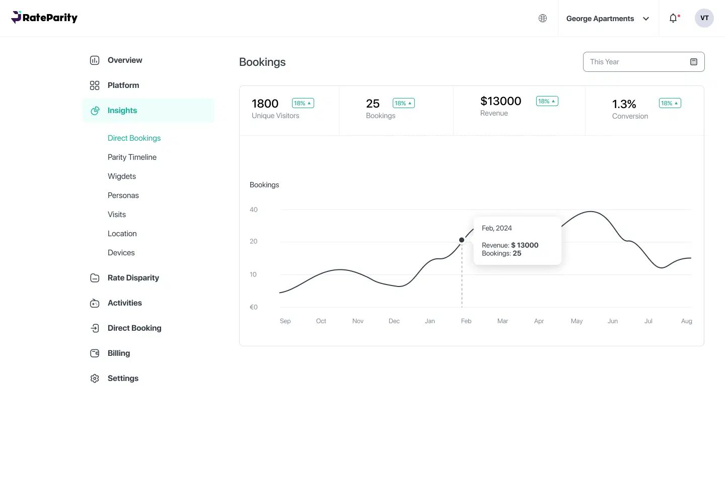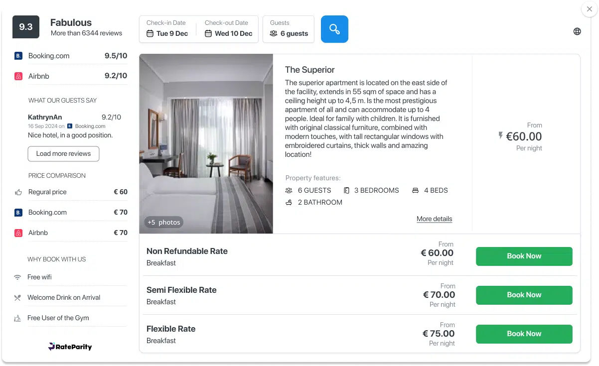 Maximize direct bookings with RateParity’s advanced platform, featuring Price Comparison, AI-Powered Chatbot, Cart Abandonment tools, Personalization, Special Offers, Smart Notes, and Reviews Widget.