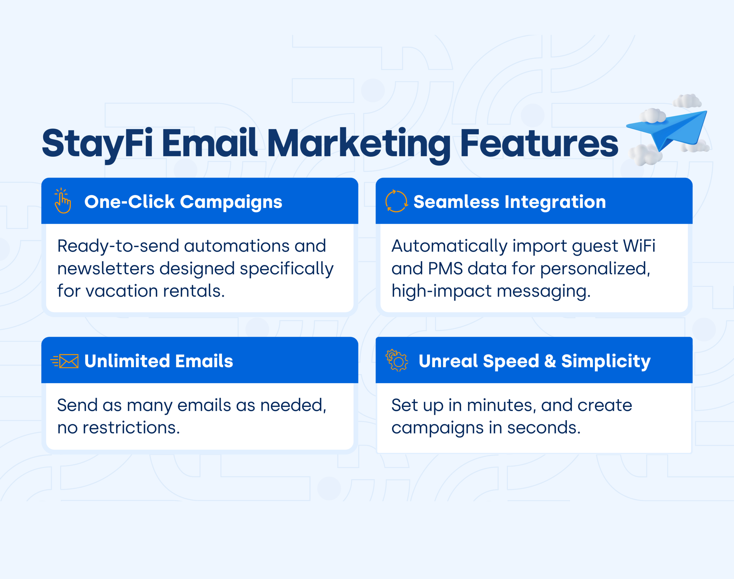 The leading WiFi, email, and text marketing solution built specifically for short-term rentals.