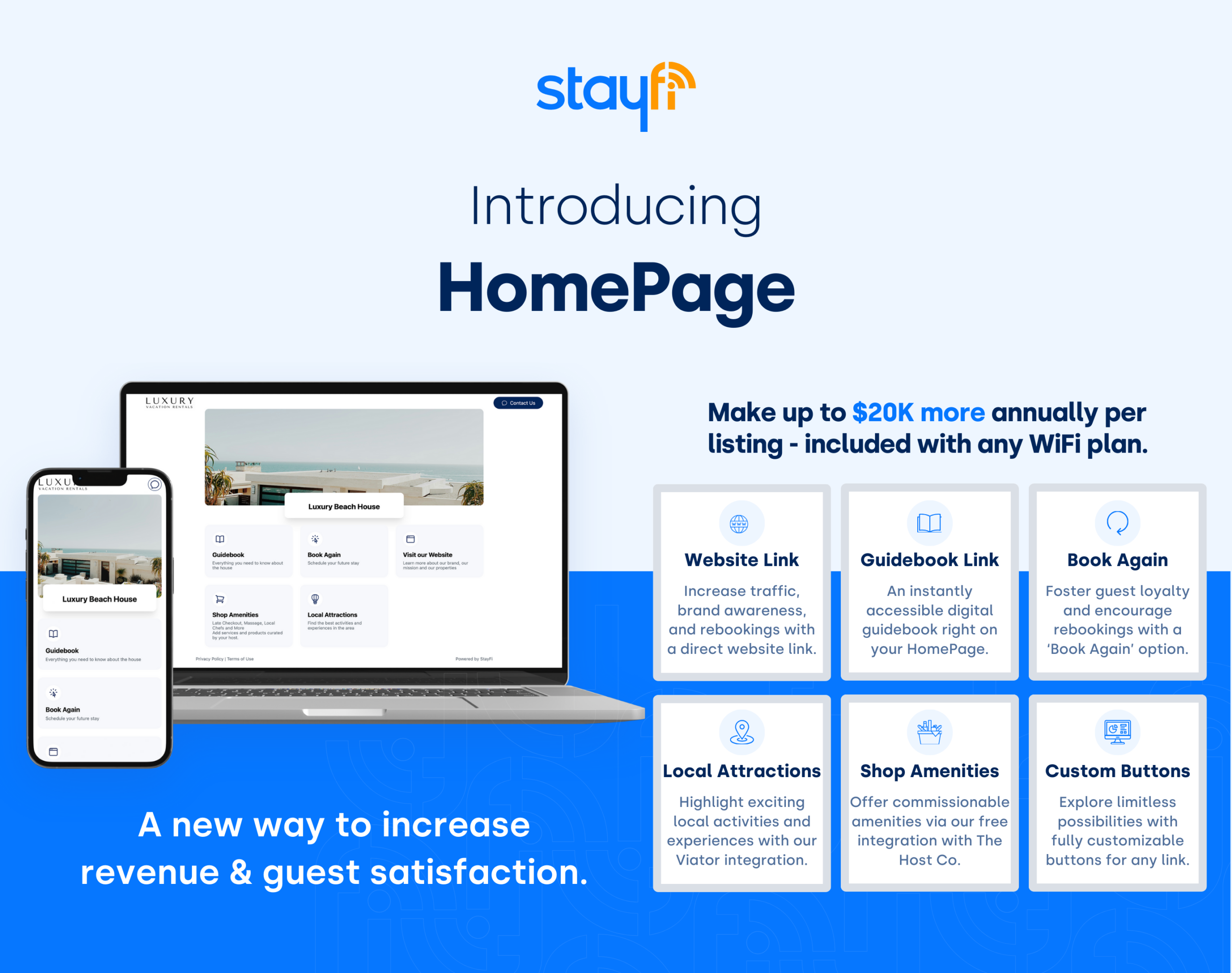 - Boost Revenue and Guest Engagement During the Stay: Promote upsells like early check-in, late checkout, and local experiences through StayFi’s guest portal and integrations, creating additional revenue opportunities during every stay.