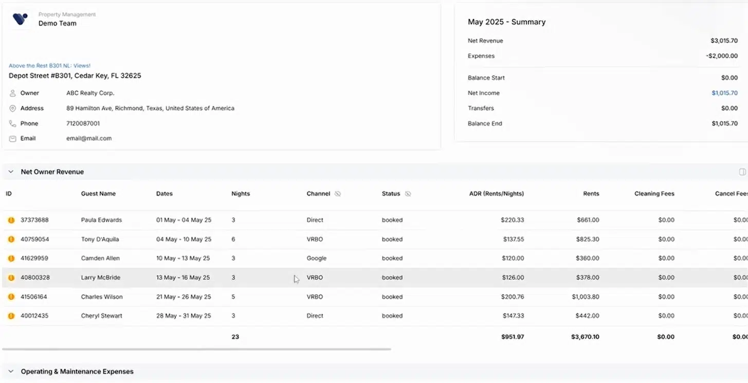 - Owner mapping: Owner data is tied to each listing and reservation, ensuring complete and accurate owner statements.