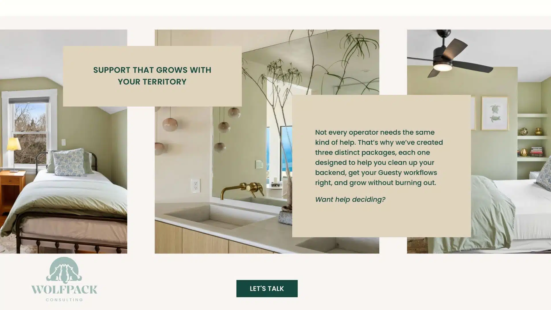 - Wolf Pack Consulting brings 20+ years of property management expertise, helping companies scale from small portfolios to 300+ units. We specialize in Guesty onboarding, process automation, and team optimization. Our approach reduces day-to-day strain, streamlines communication, and empowers your team to focus on growth—not just operations. Get the right systems and people working together.
